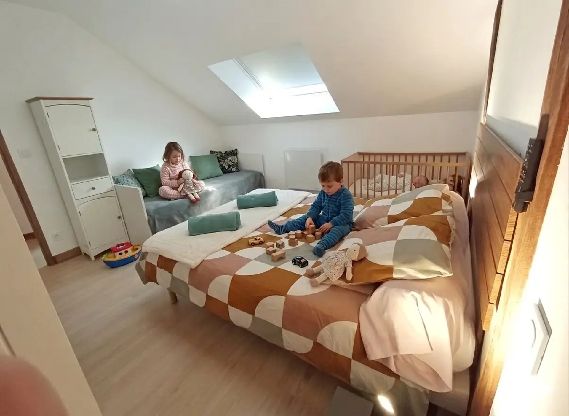 Un espace modulable comprenant un grand lit, un lit banquette et un véritable lit bébé.