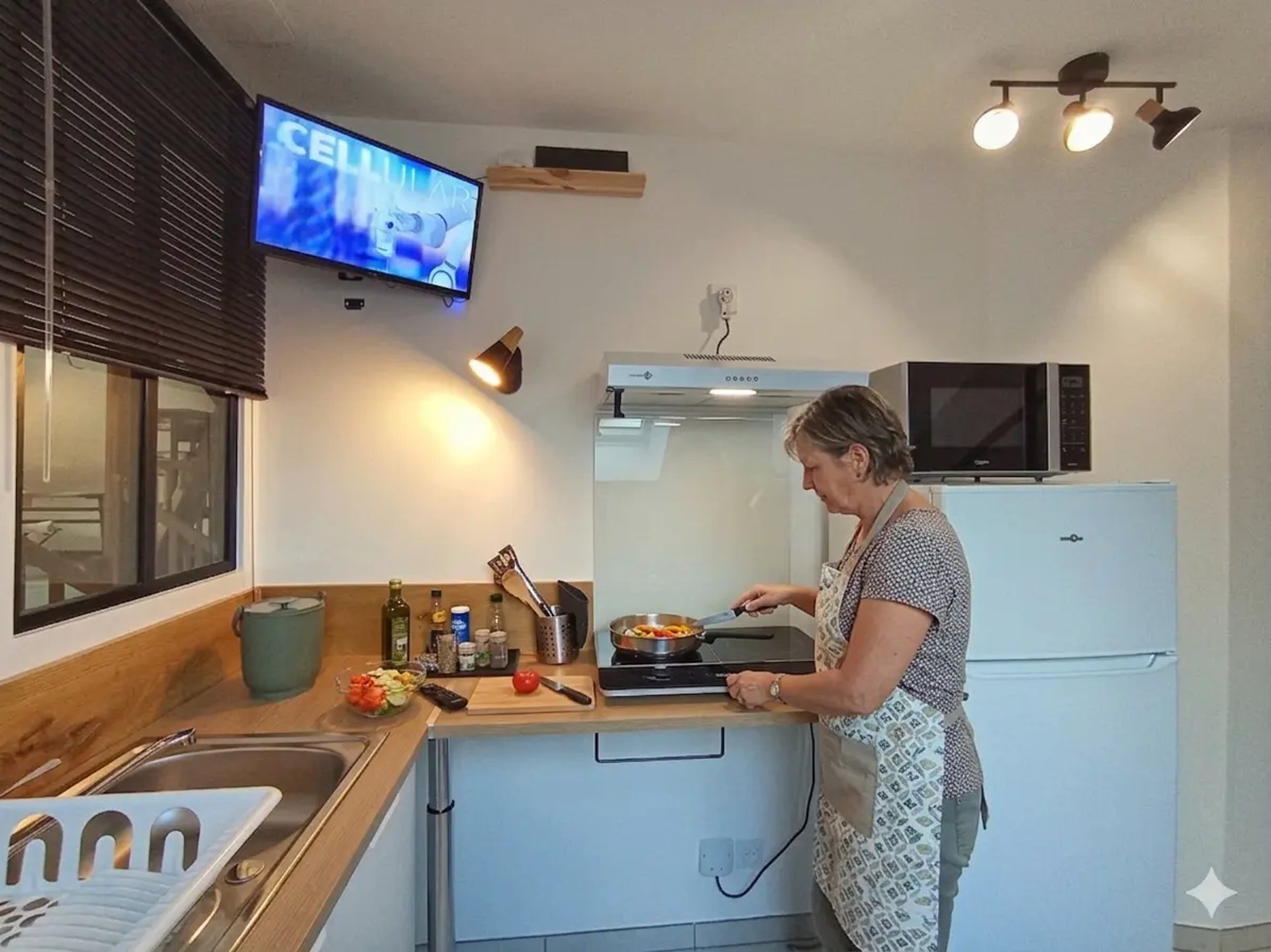 Équipement complet : Plaques à induction, four, micro-ondes et réfrigérateur.